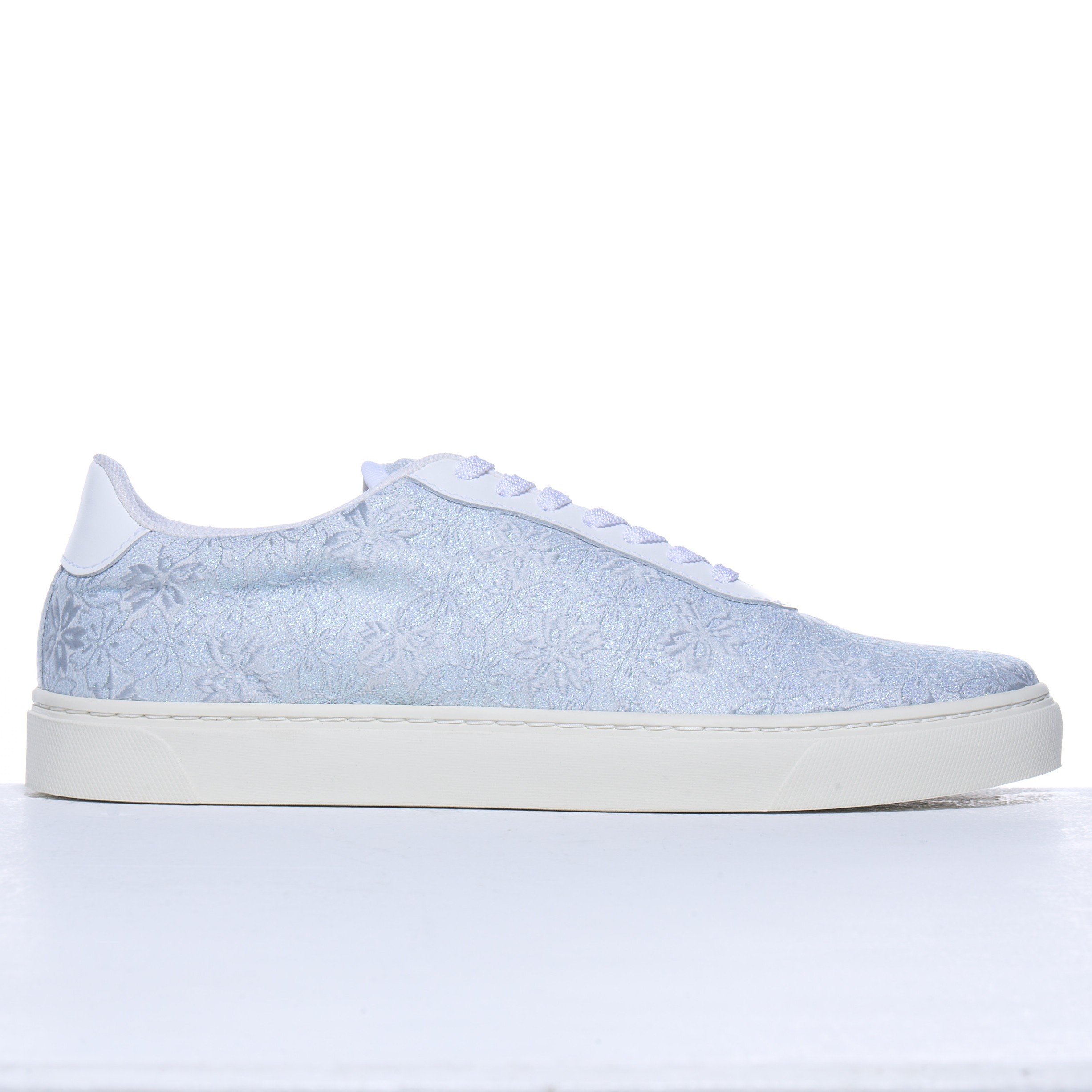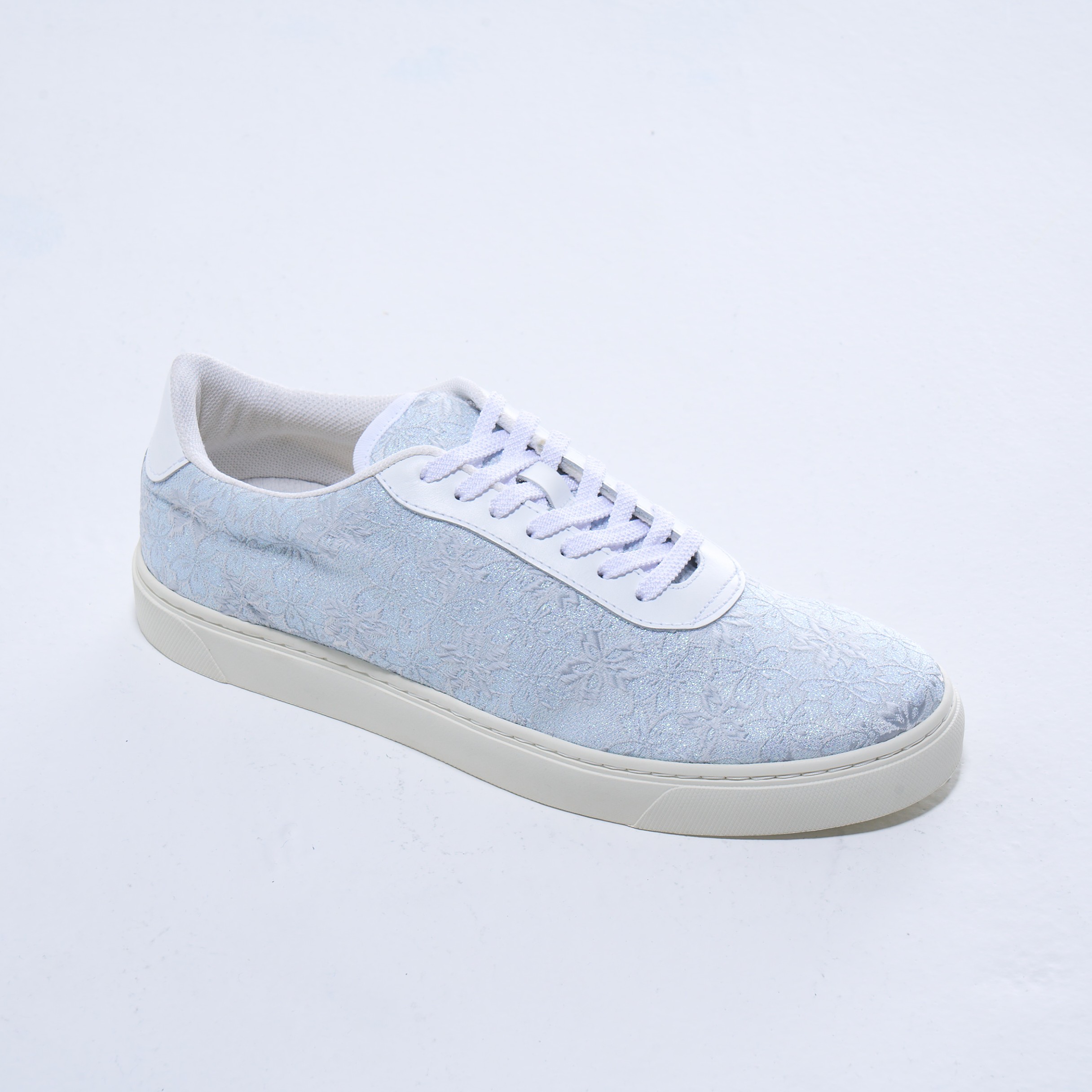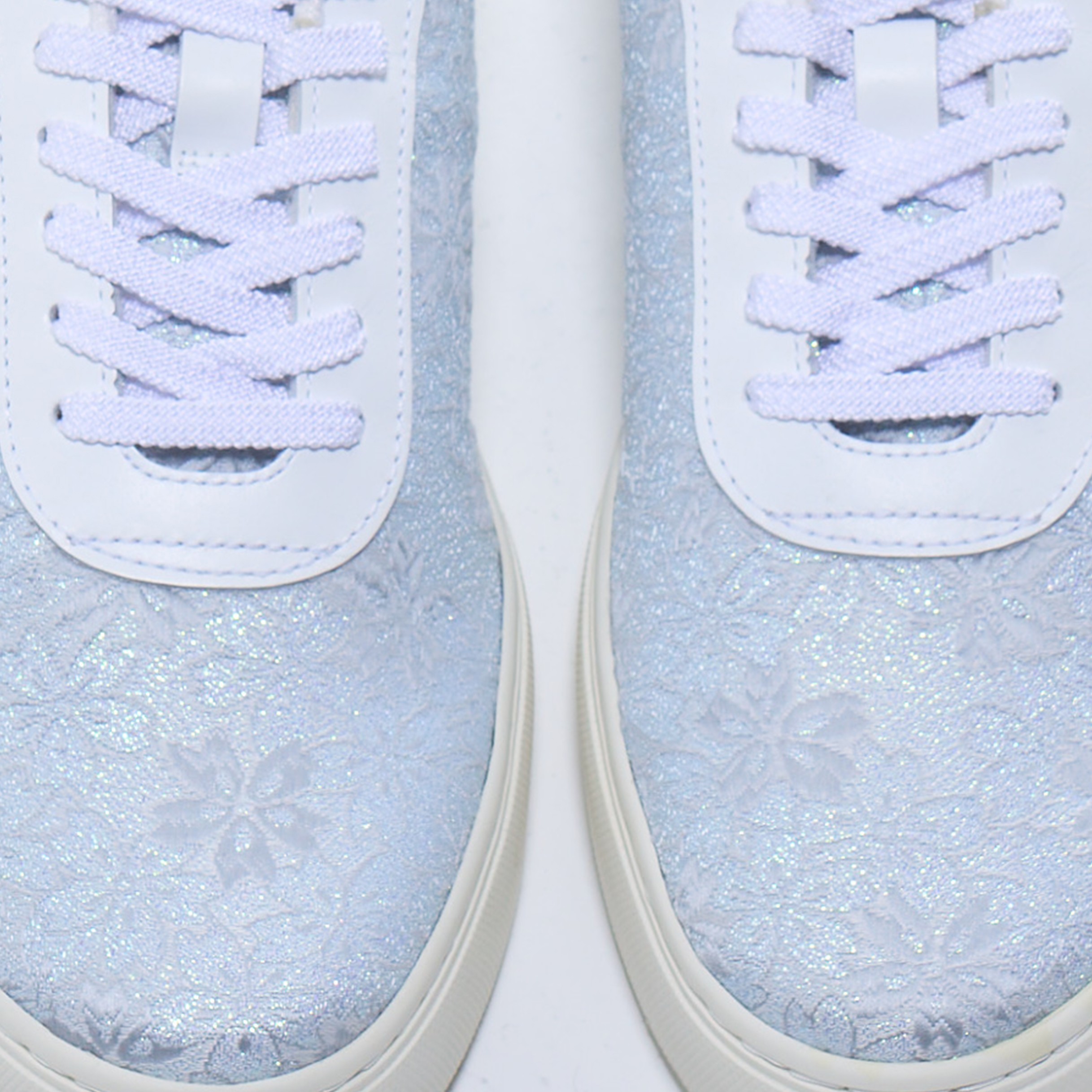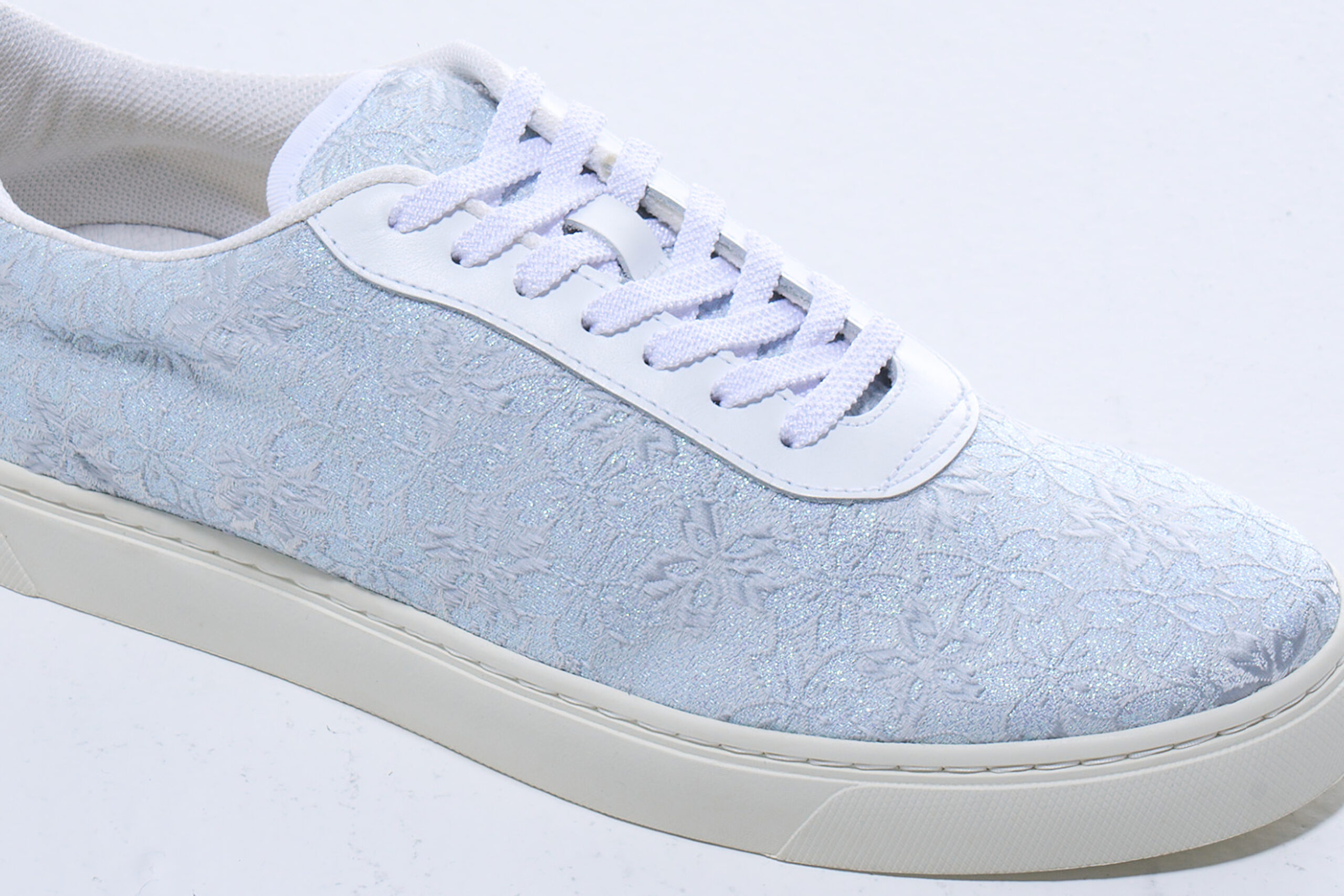 さらに、随所に織り込まれたパール箔が、光の角度によってほのかに輝き、清楚な中にさりげない華やぎを添えています。強い煌めきではなく、水面に反射するやわらかな光のような上品さが特徴で、足元に瑞々しい印象をもたらします。白の静けさ、桜のやさしさ、そして控えめな輝きが調和し、凛とした美しさと柔らかな幸福感を同時に感じさせるデザインに仕上がっています。