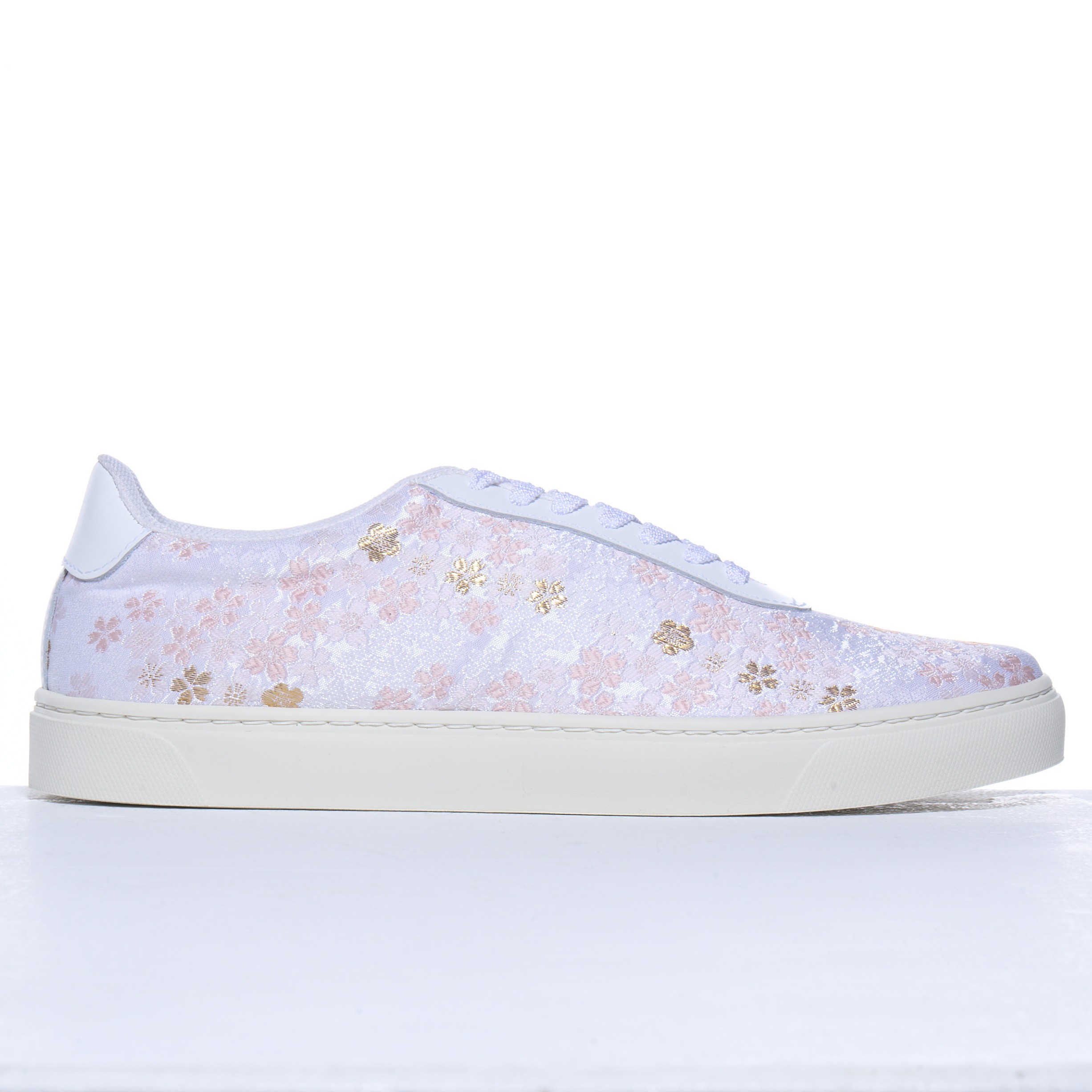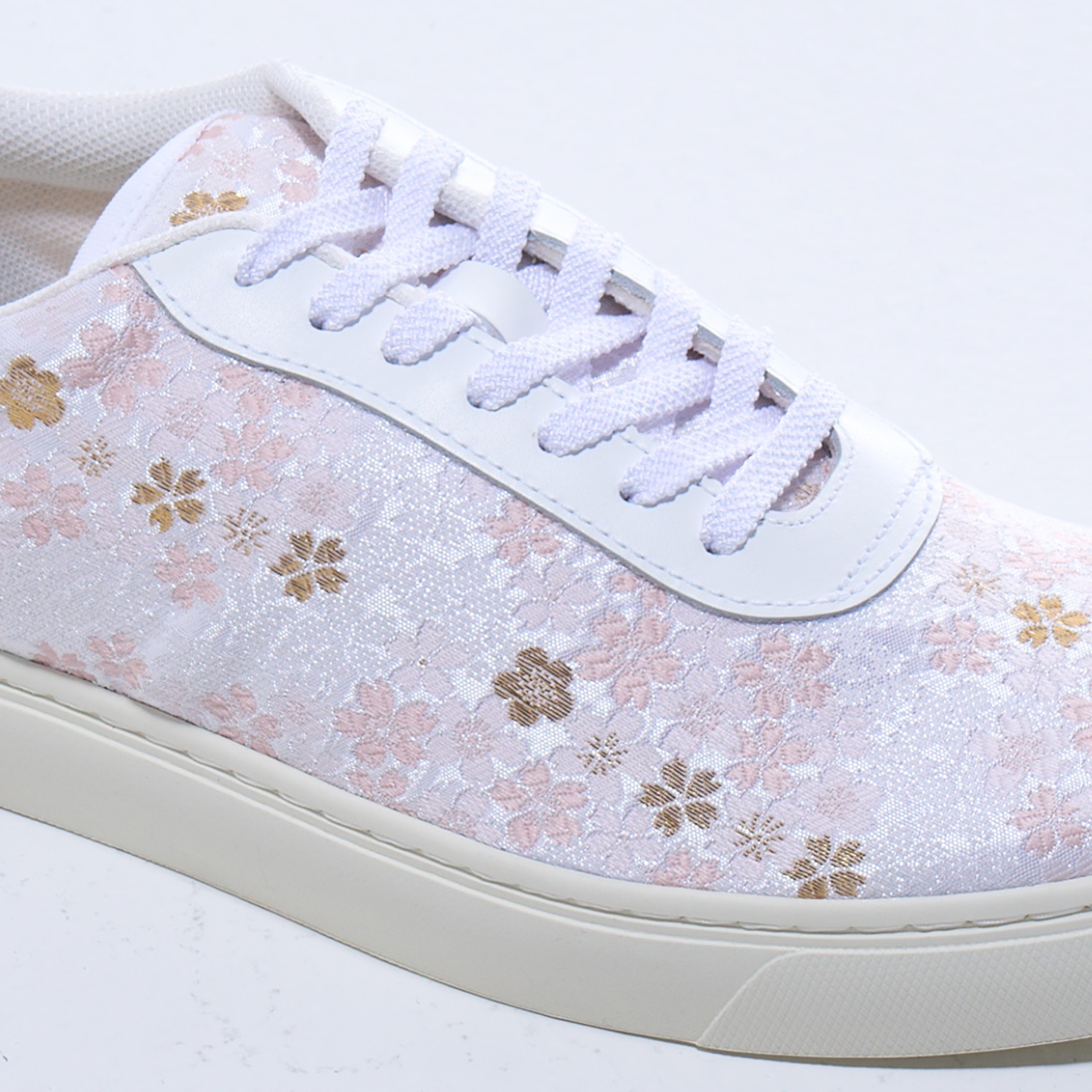 Furthermore, this piece achieves a multi-layered expression by subtly incorporating cherry blossom motifs into the ground pattern, allowing them to overlap with the surface design. The closer one looks, the more the cherry blossoms emerge from the depths of the weave, evoking a sense of quiet expansiveness and elegant brilliance. The use of foil thread was deliberately minimized to avoid excessive shine, highlighting the beauty of the gradations created by the colored threads. The delicate weaving unique to Nishijin textiles, which changes expression with the light, brings a subtle yet memorable presence to the feet.