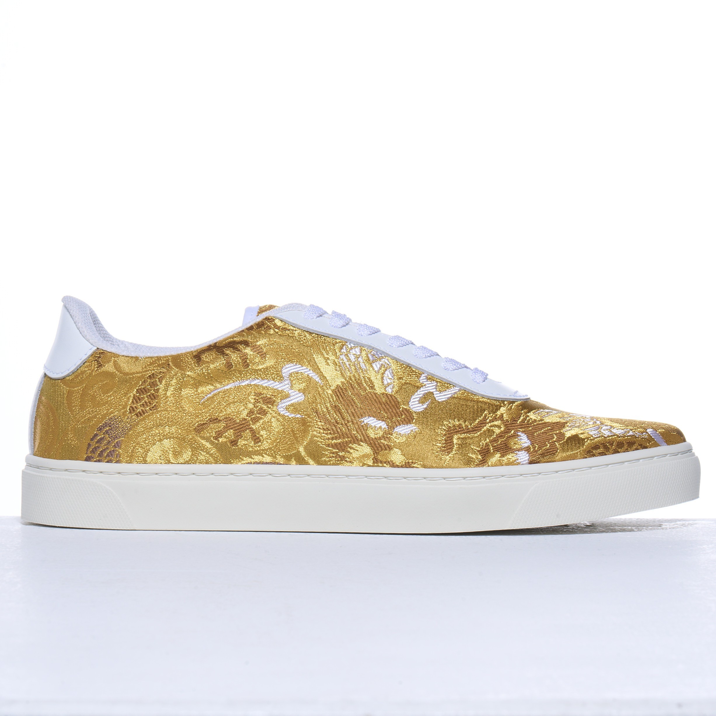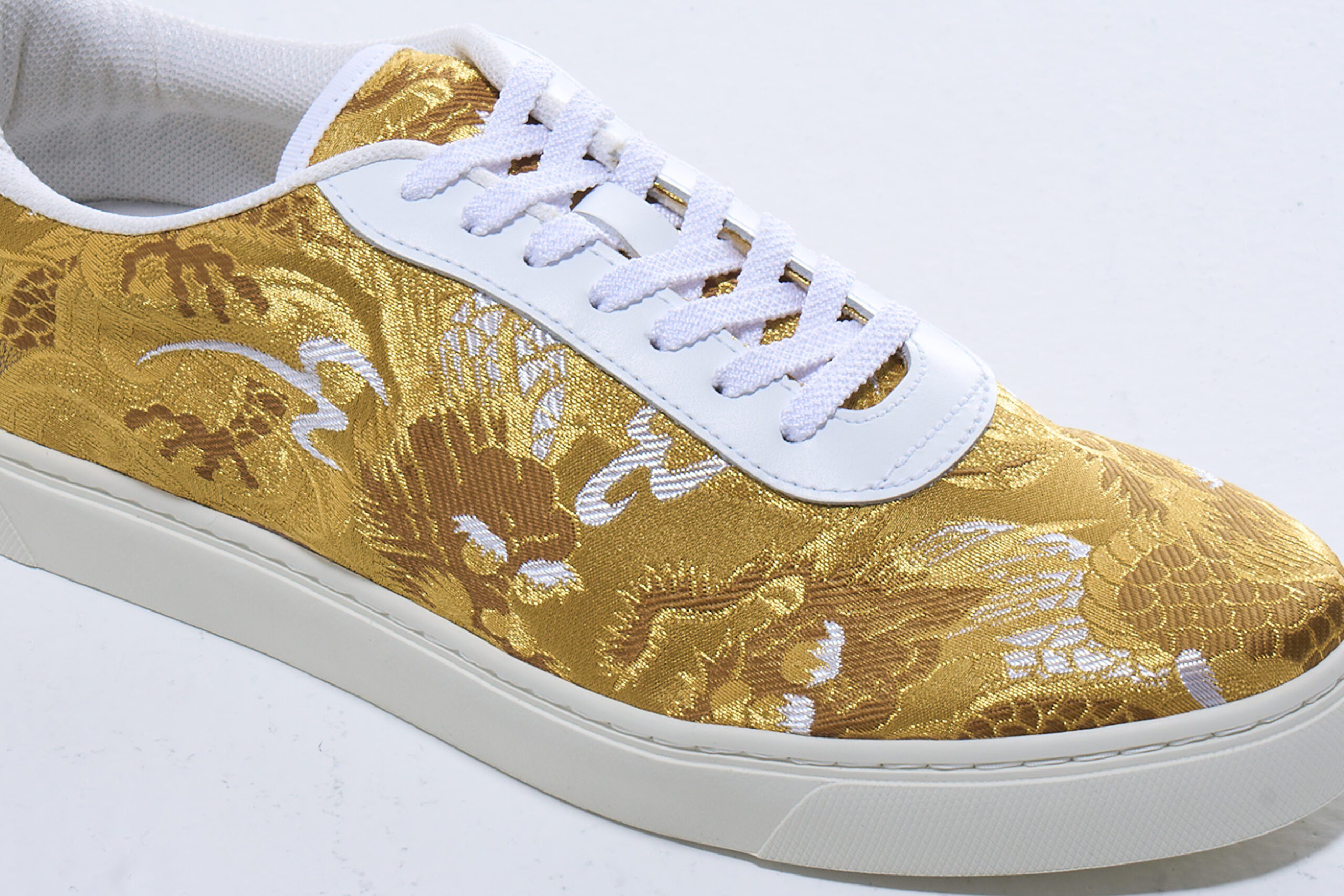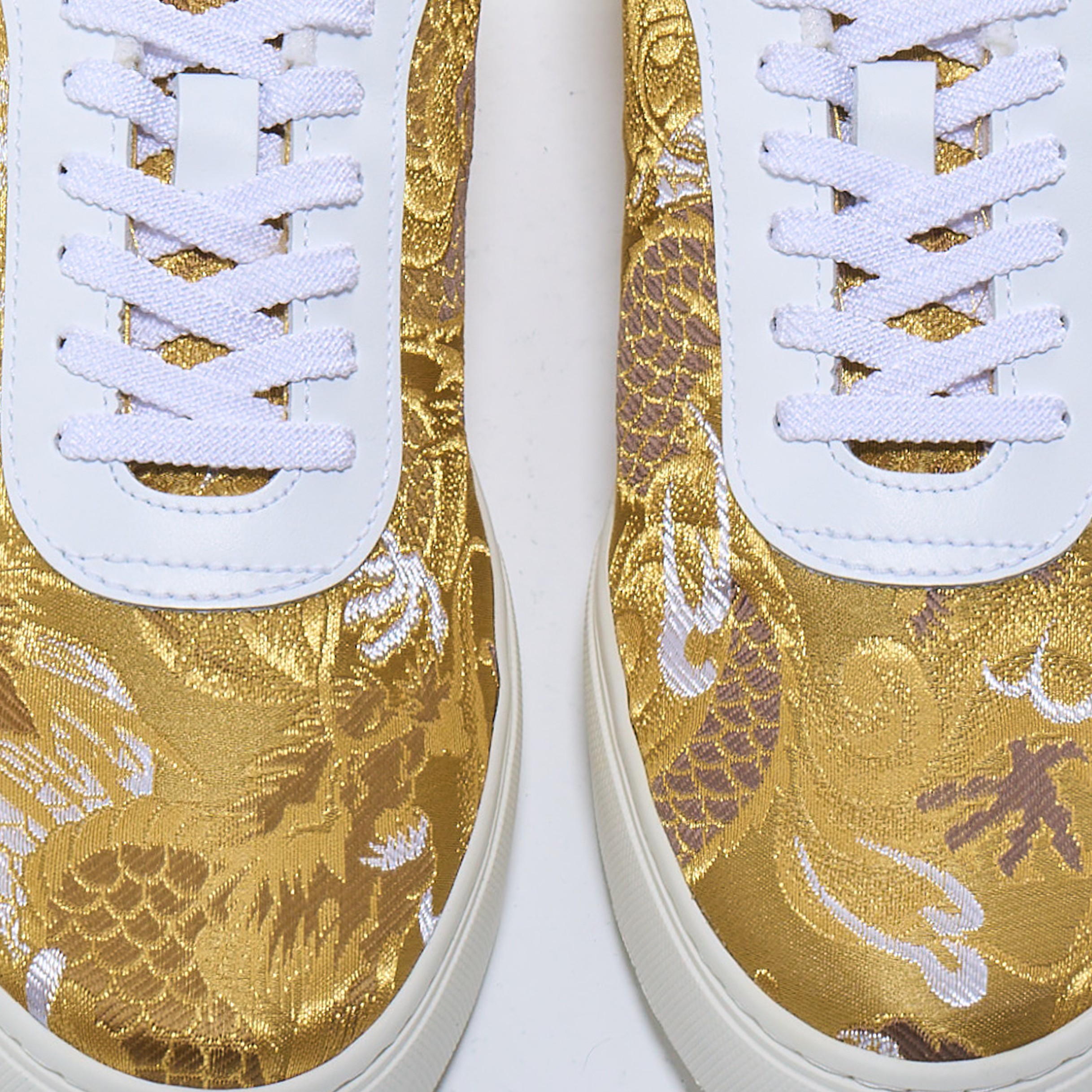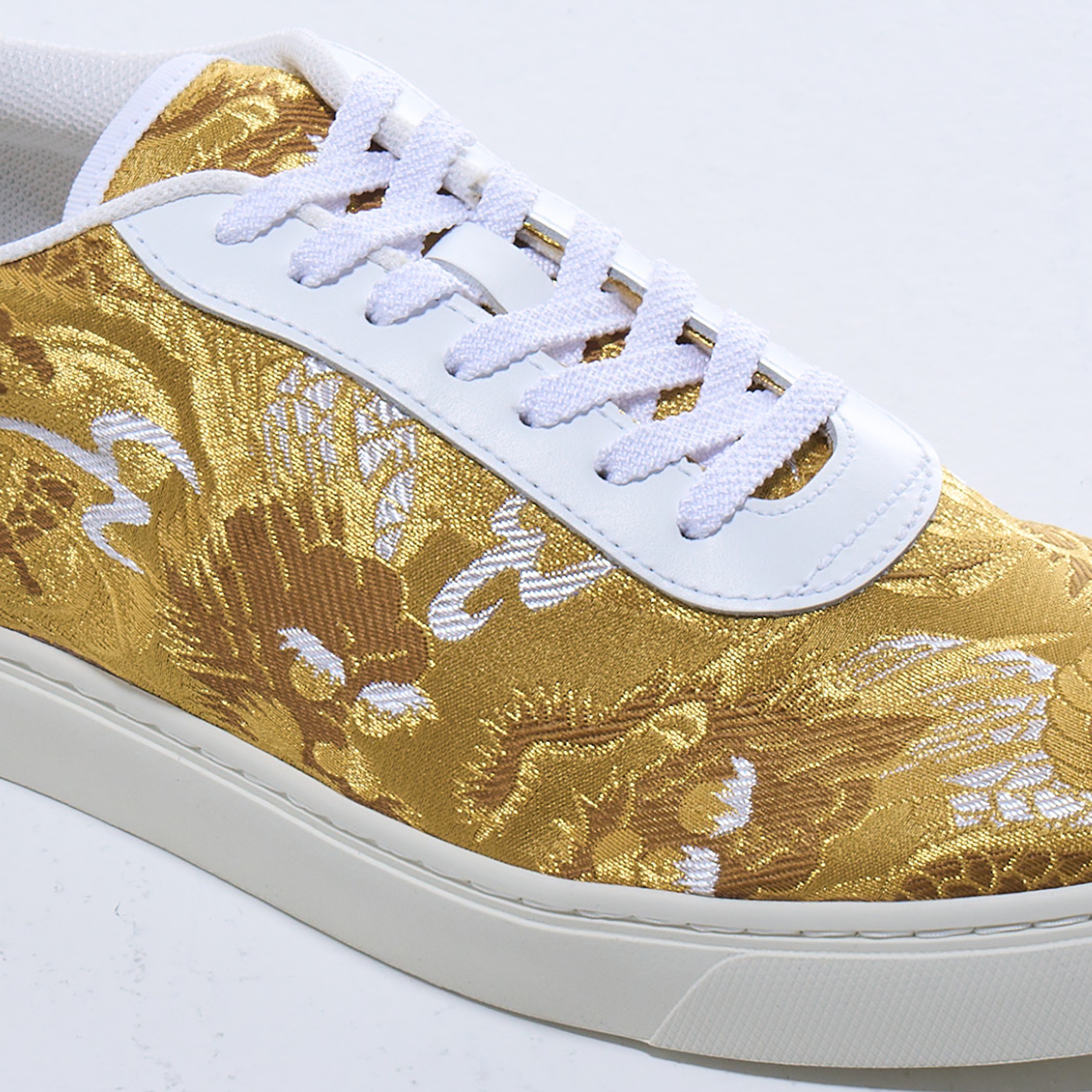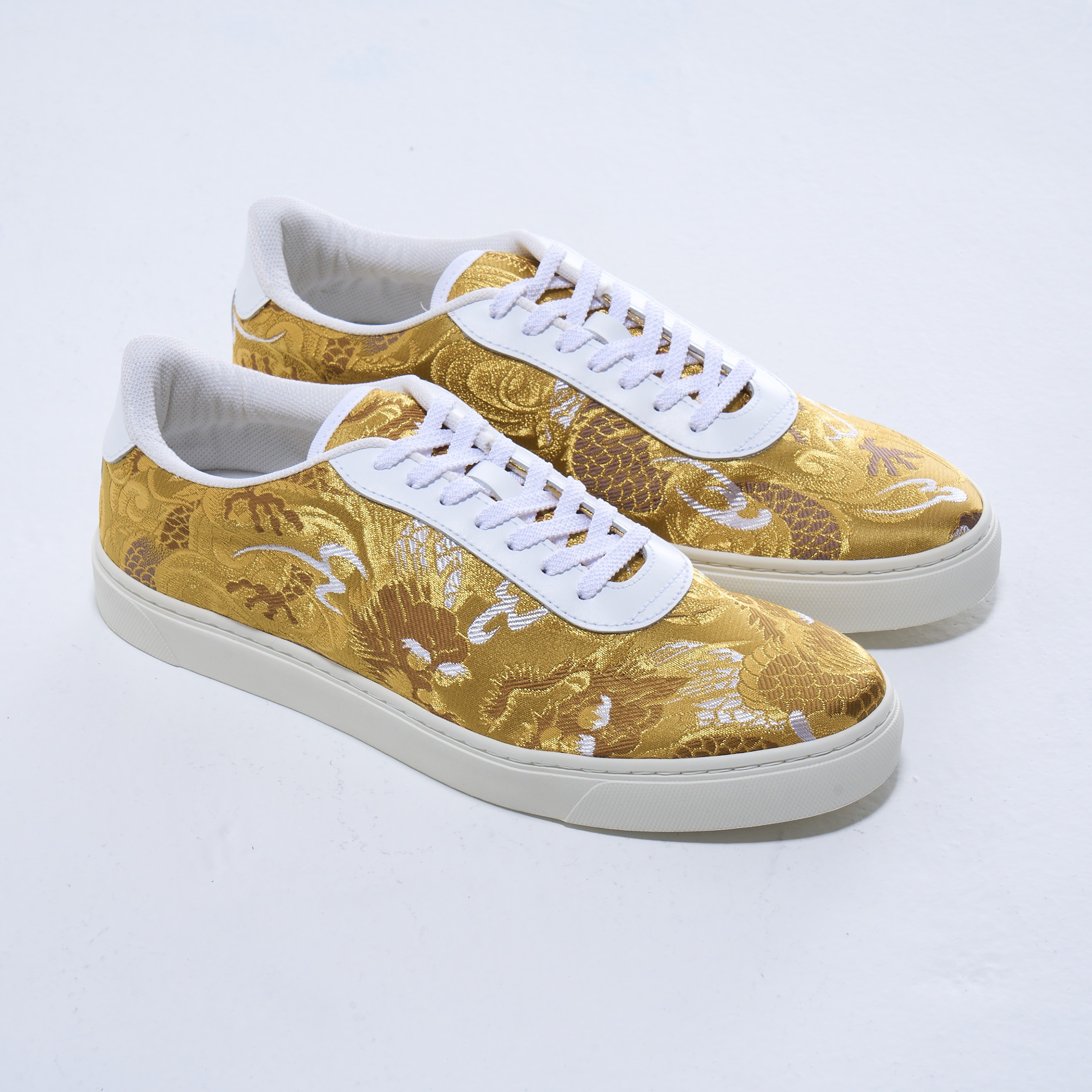 Designed to seamlessly blend the striking patterns of Nishijin-ori into everyday wear, this cup sole style features a minimalist form that accentuates the rich, golden-ground dragon-and-cloud motif while maintaining a clean, cohesive silhouette.