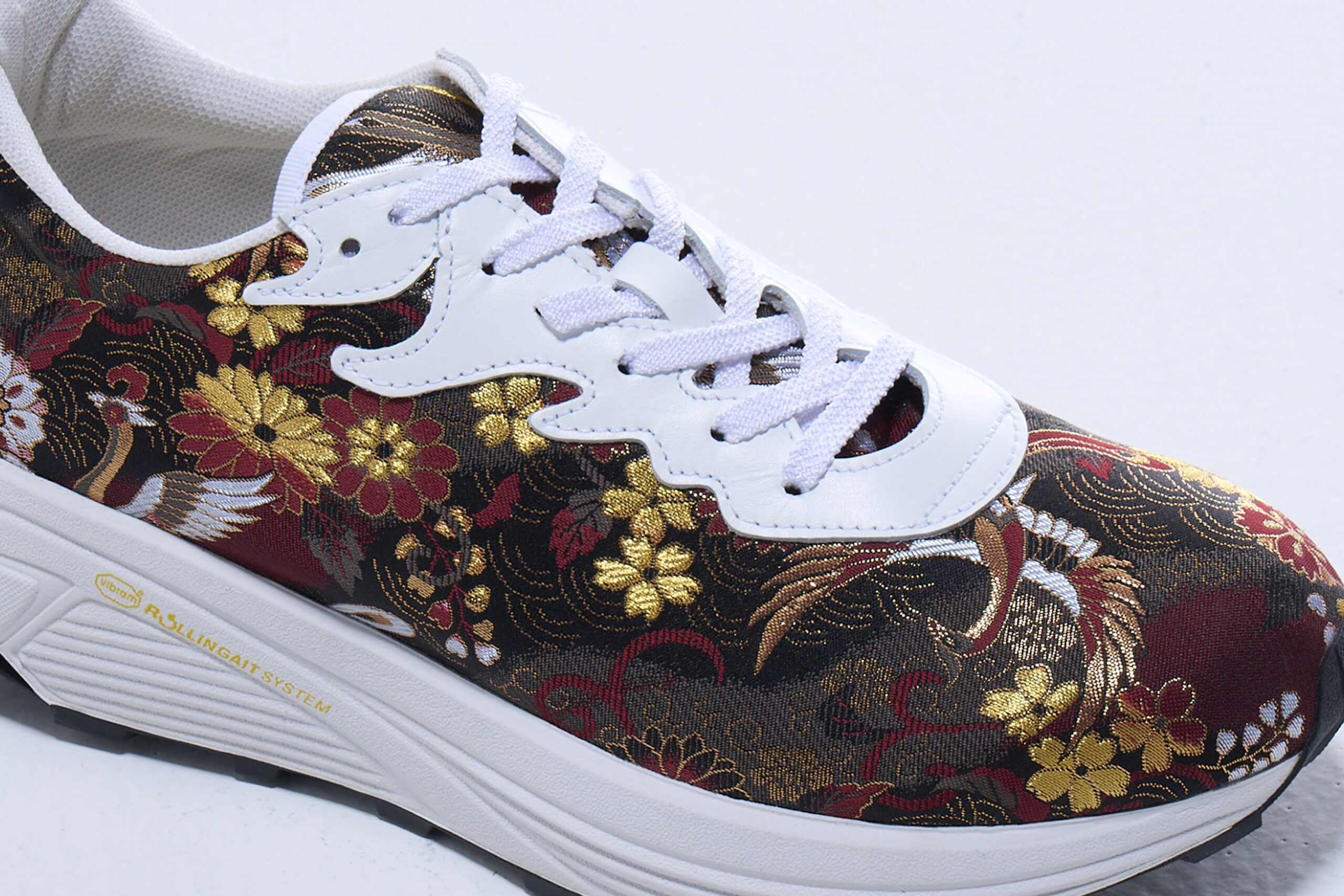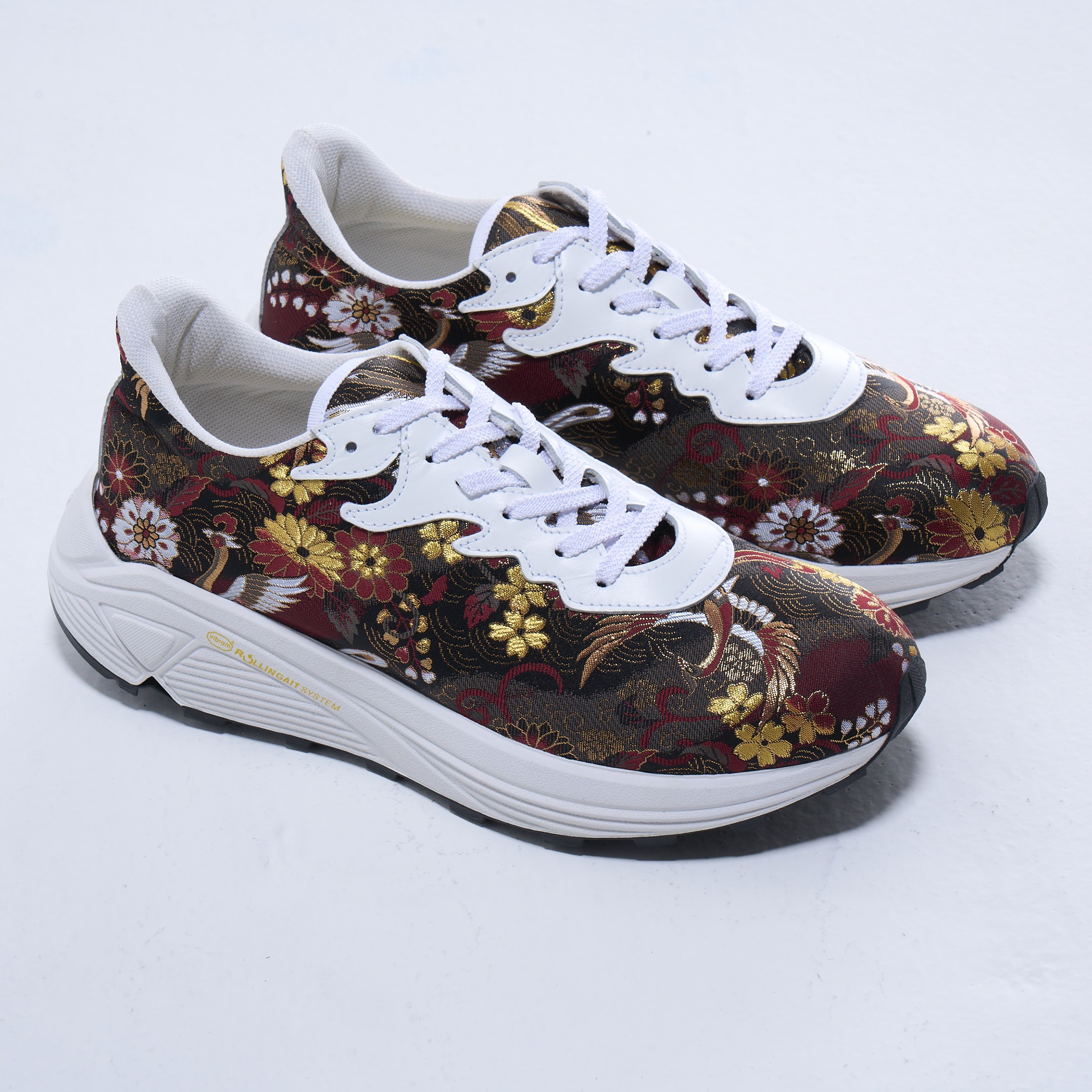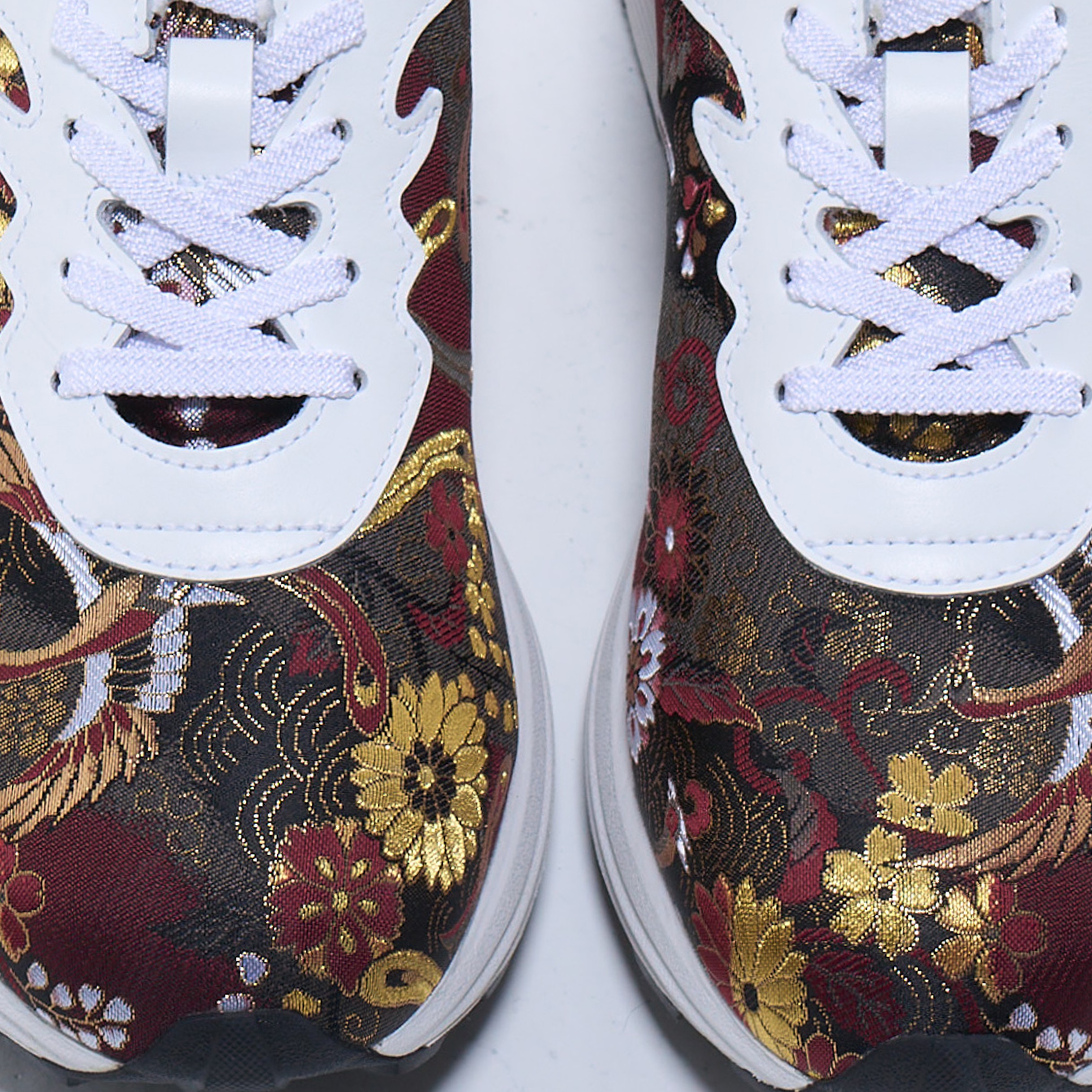 丸みを帯びた未来的なフォルムは、力強い文様を柔らかく包み込み、伝統柄を現代のライフスタイルへと違和感なく溶け込ませます。日常の装いの中で、確かな存在感と静かな推進力を感じられる一足です。