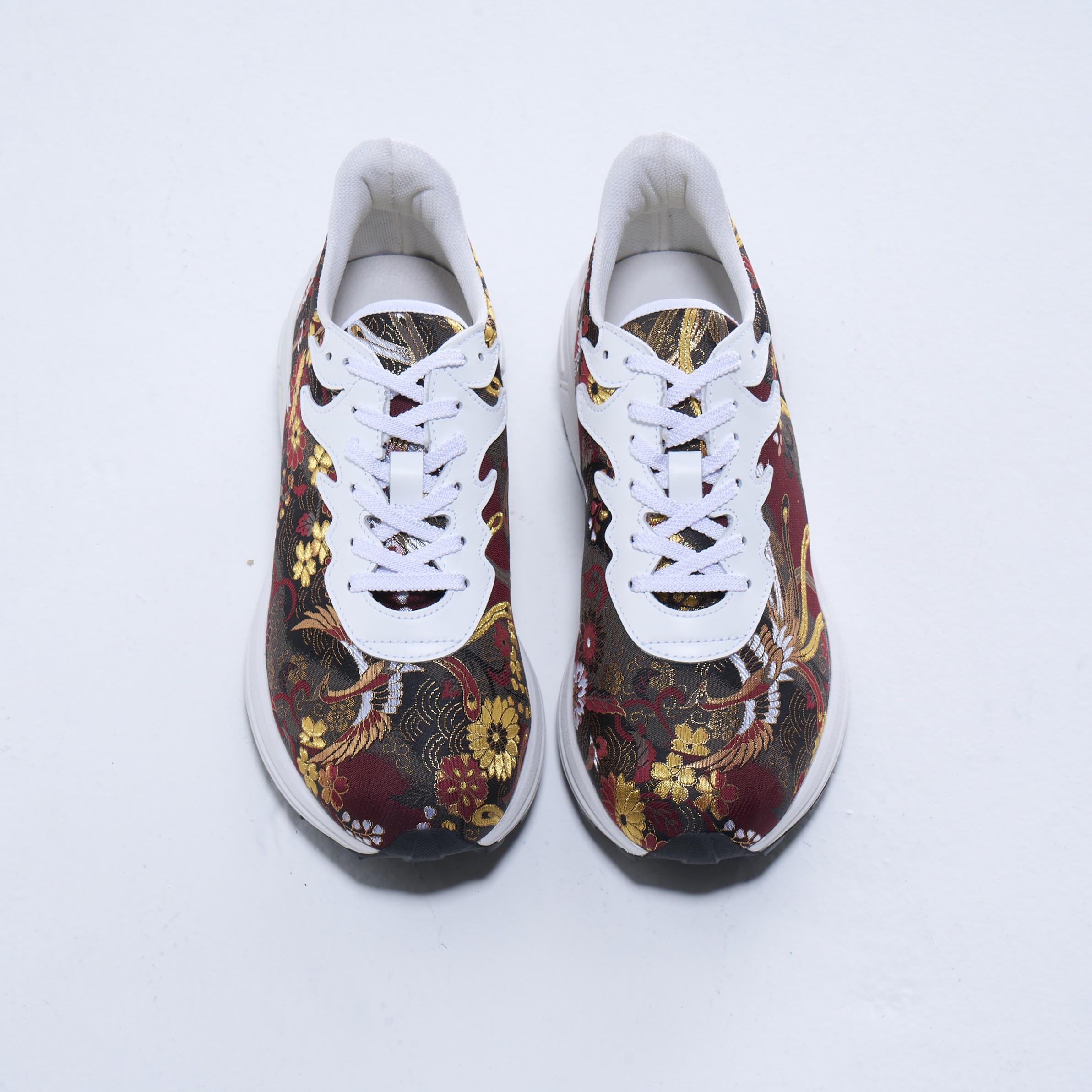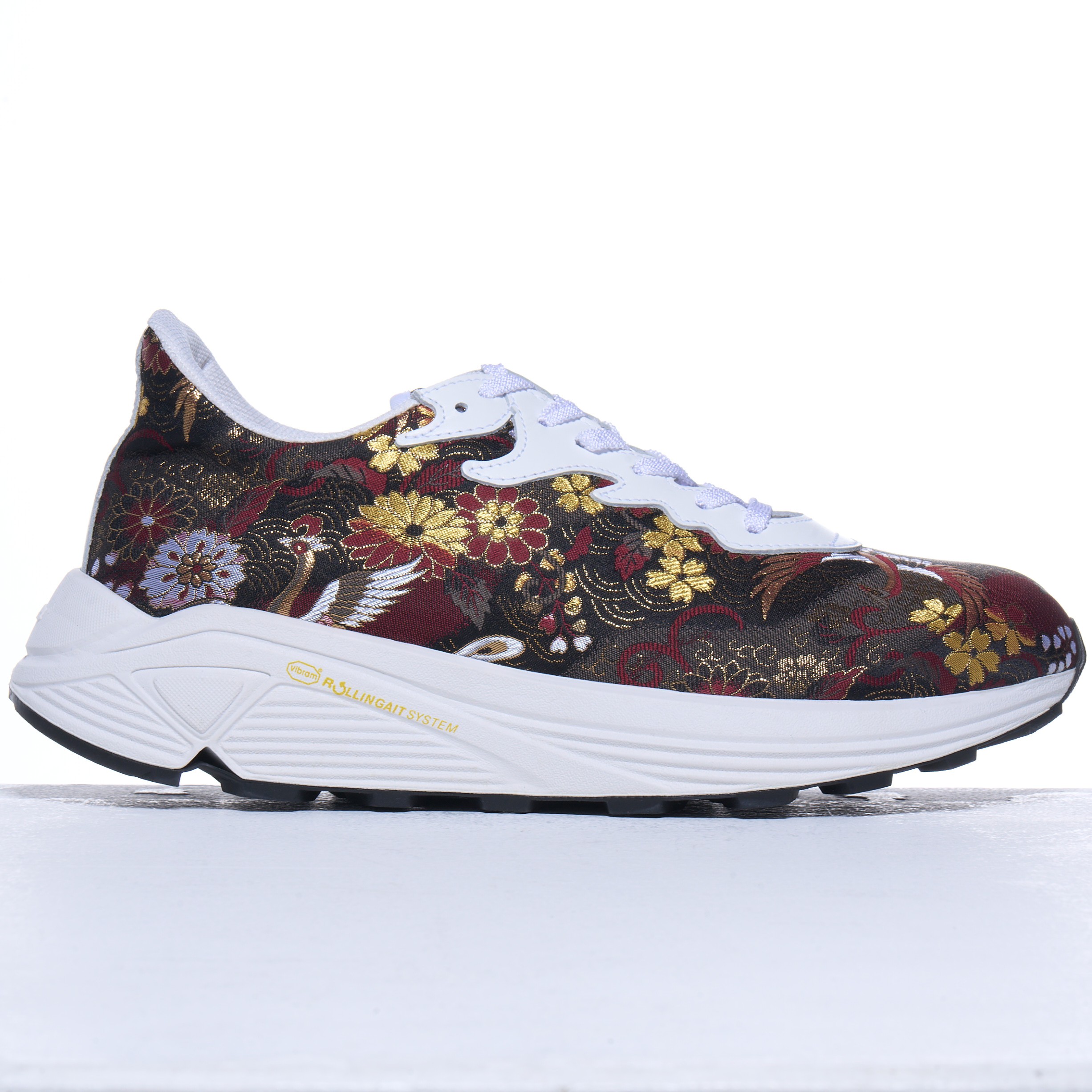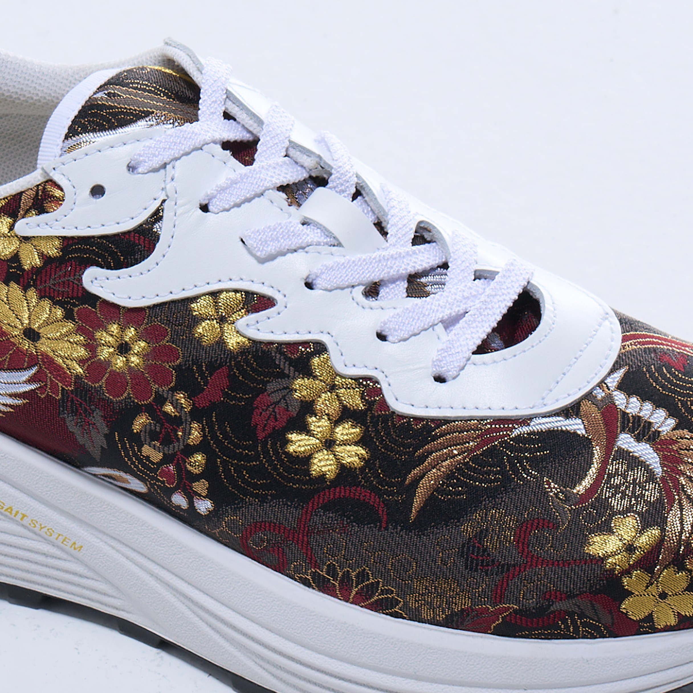 丸みを帯びた未来的なフォルムは、力強い文様を柔らかく包み込み、伝統柄を現代のライフスタイルへと違和感なく溶け込ませます。日常の装いの中で、確かな存在感と静かな推進力を感じられる一足です。