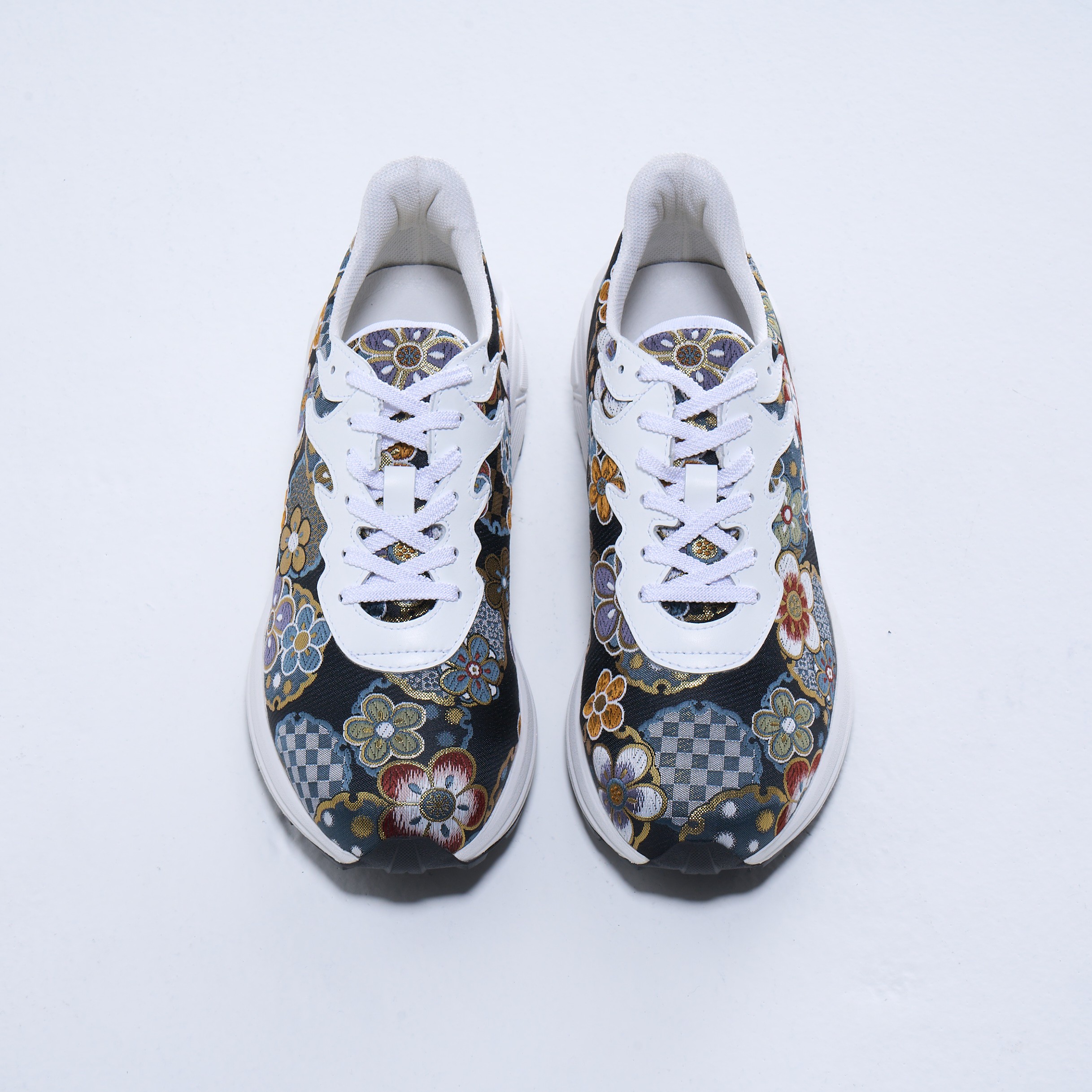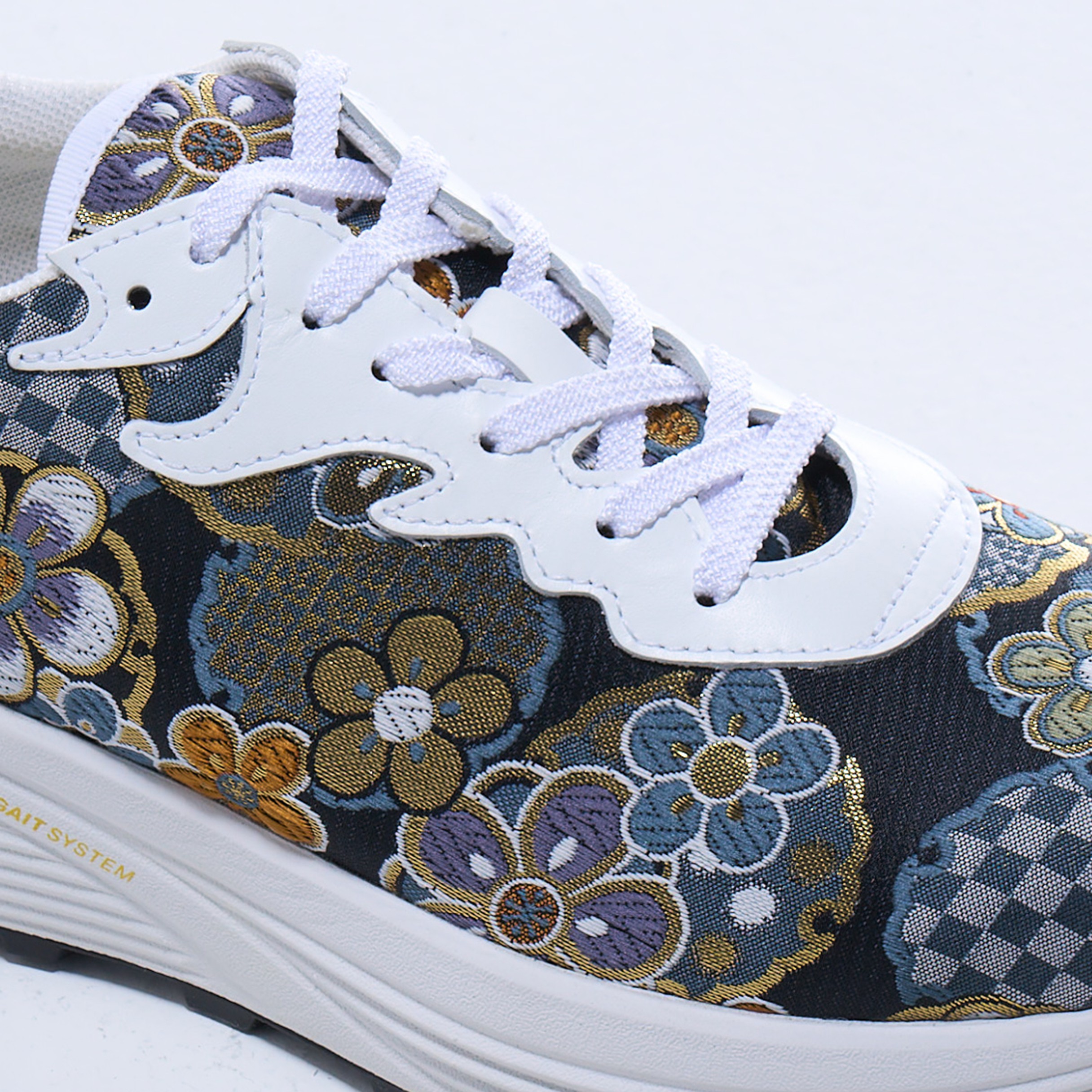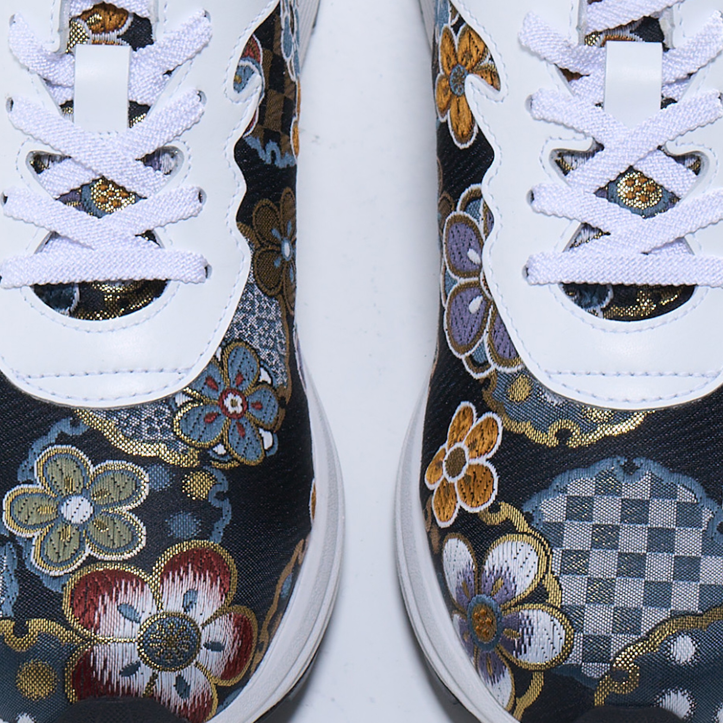 The RGS model features a Rolling Gait System sole that naturally guides your stride forward. It smoothly facilitates weight transfer from heel to toe, reducing strain during walking. This ensures comfortable wear even during long outings or city strolls. Combined with a vibrant indigo-dyed tea-ground snowflake pattern and auspicious floral motifs, it creates a pair that offers both visual appeal and functionality.