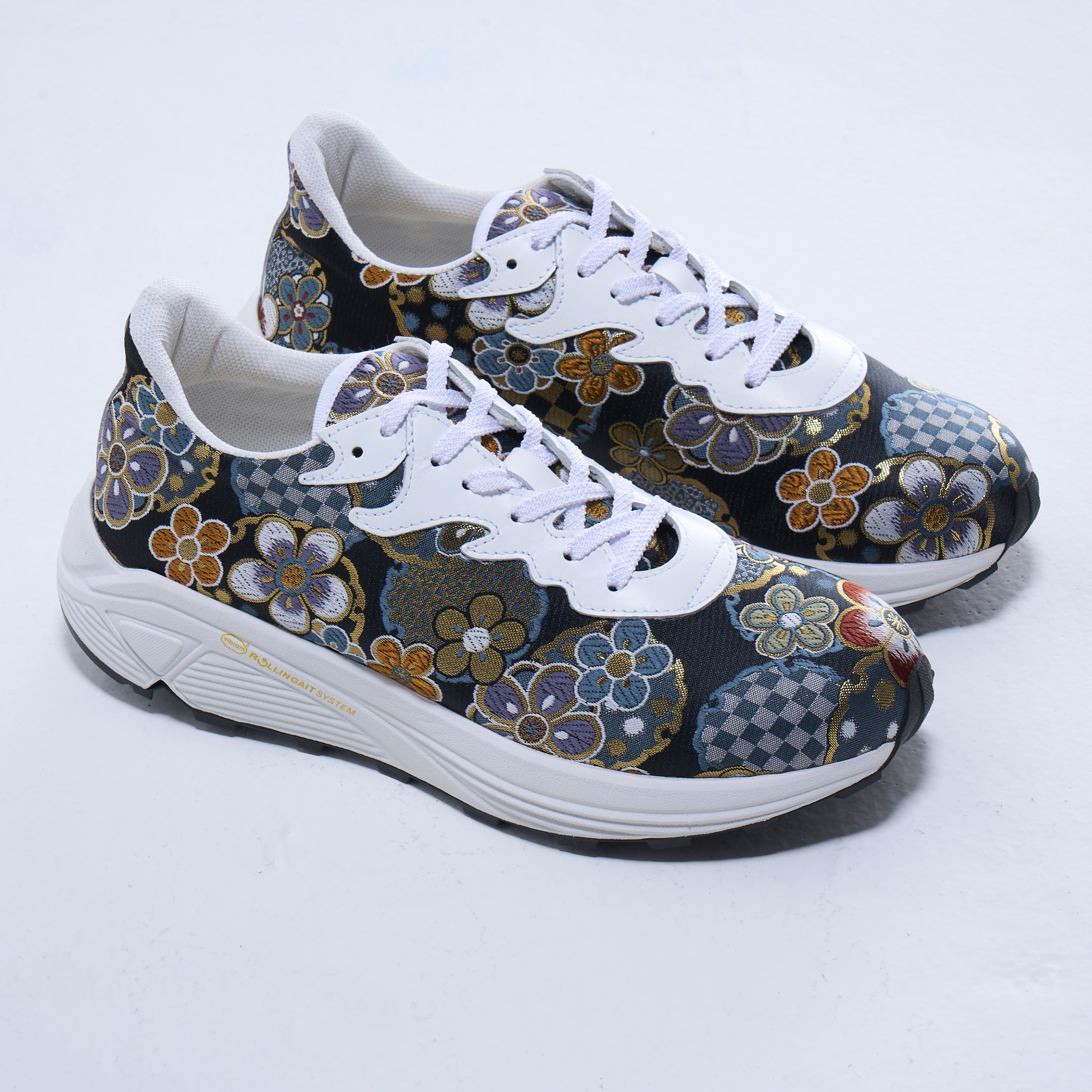 RGSモデルは、足運びを自然に前へと導くローリングゲートシステムソールを採用しています。かかとからつま先へと体重移動をスムーズに促し、歩行時の負担を軽減。長時間の外出や街歩きでも快適な履き心地を保ちます。華やかな藍墨茶地雪輪に吉祥華紋のデザインと組み合わさることで、見た目の楽しさと機能性を兼ね備えた一足に仕上がっています。