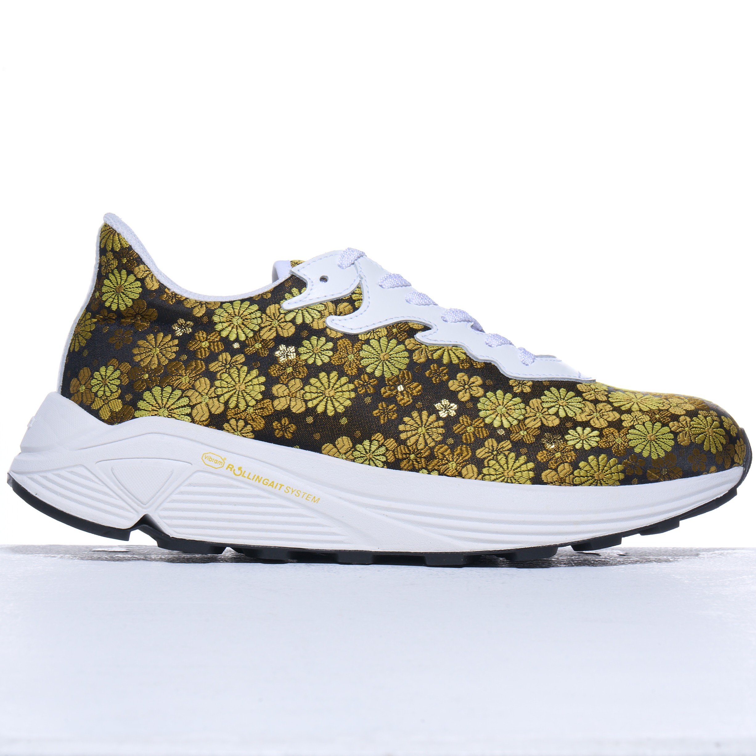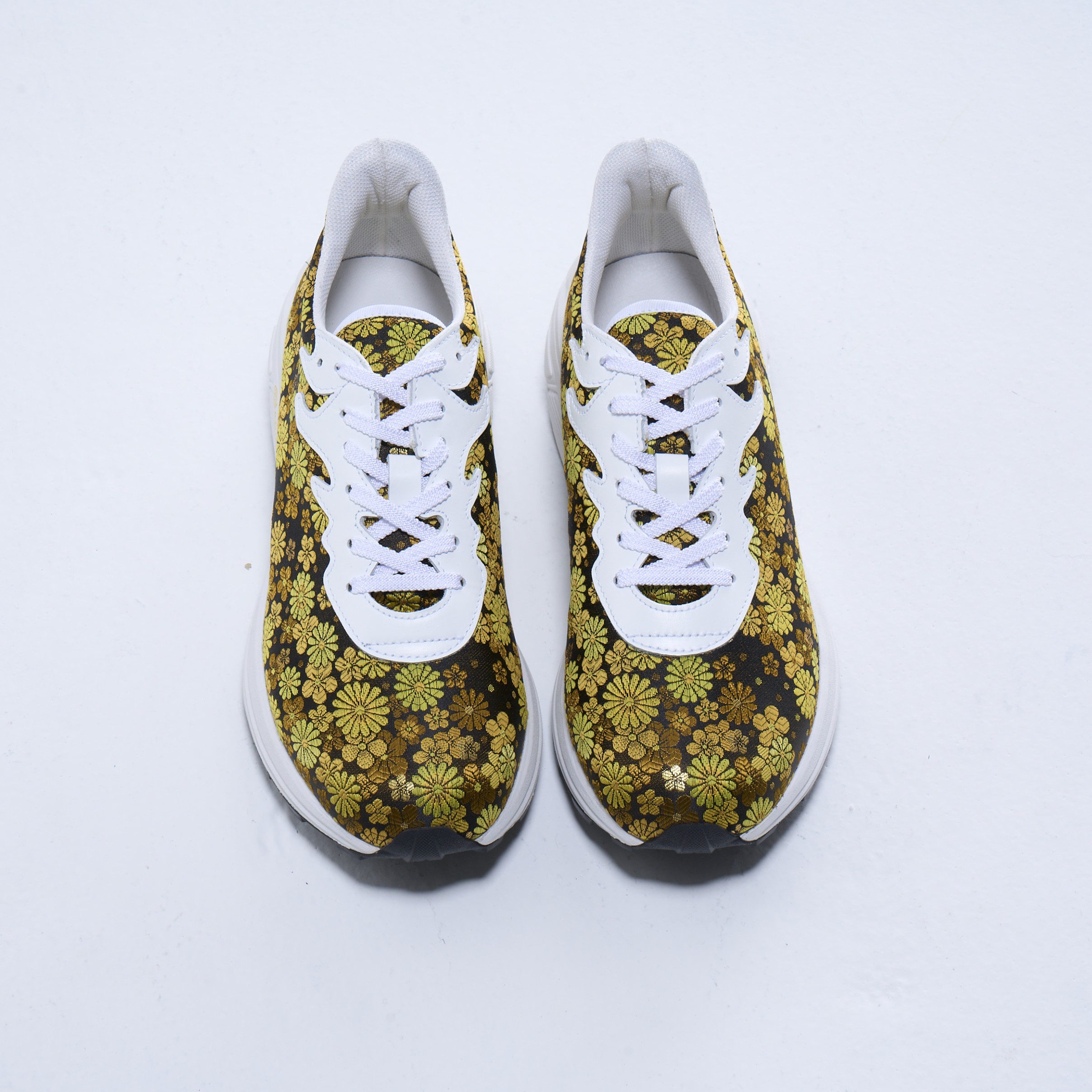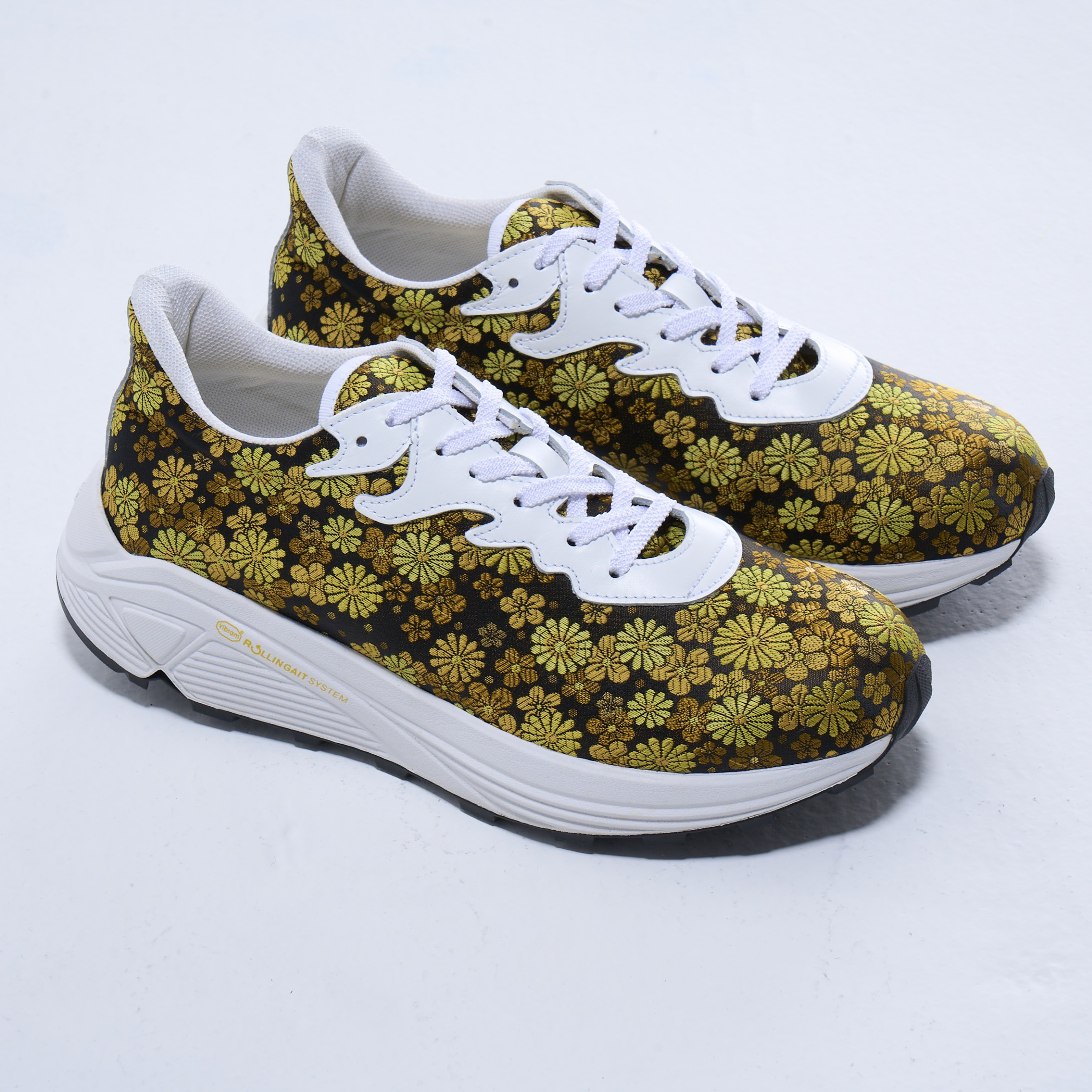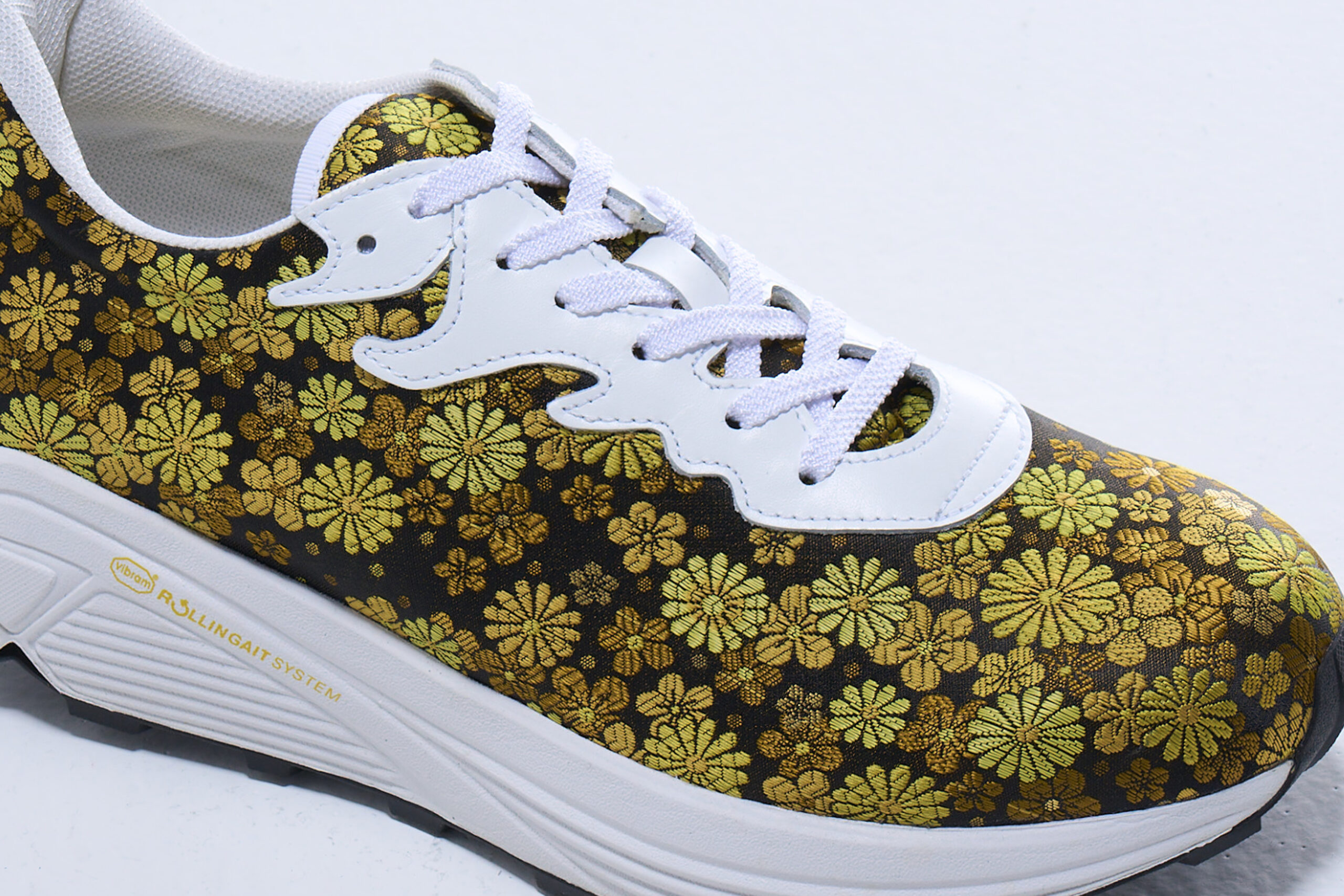 丸みを帯びた未来的なフォルムは、小花散らしの柔らかな表情と美しく調和し、伝統的な文様を現代的に昇華。日常使いから少し特別なシーンまで、さりげなく寄り添いながら、確かな存在感を放つ一足です。